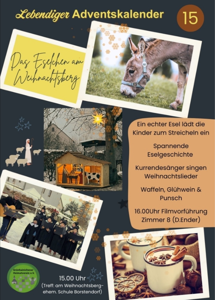 15. Dezember @ 15:00 - 17:00 Lebendiger Adventskalender-Das Eselchen am Weihnachtsberg Ehemalige Schule Borstendorf August- Bebel-Str. 67, Grünhainichen OT Borstendorf, Sachsen, Deutschland