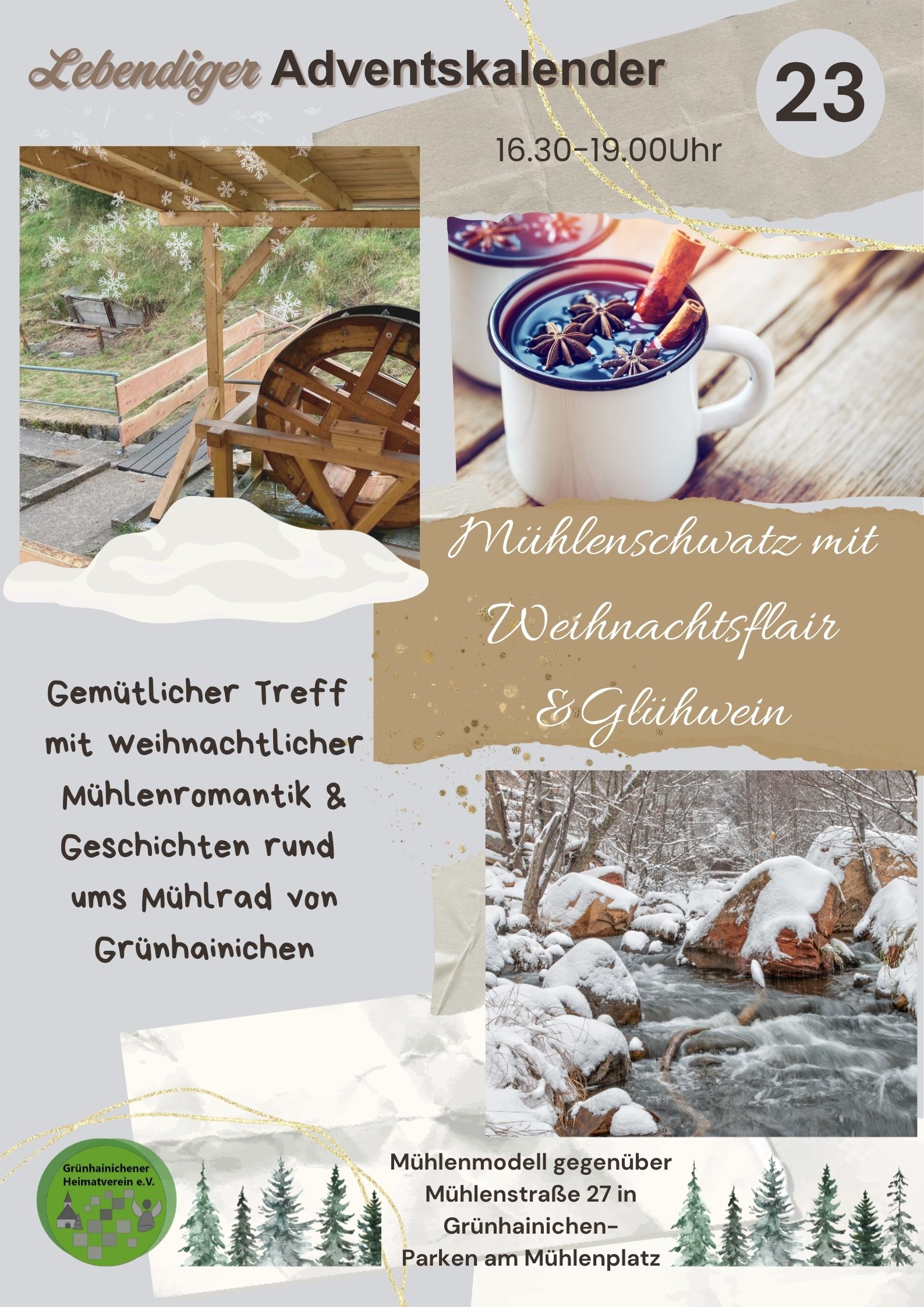 23. Dezember @ 16:30 - 19:00 Lebendiger Adventskalender-Mühlenschwatz mit Weihnachtsflair Mühlrad Grünhainichen Mühlenstraße 27