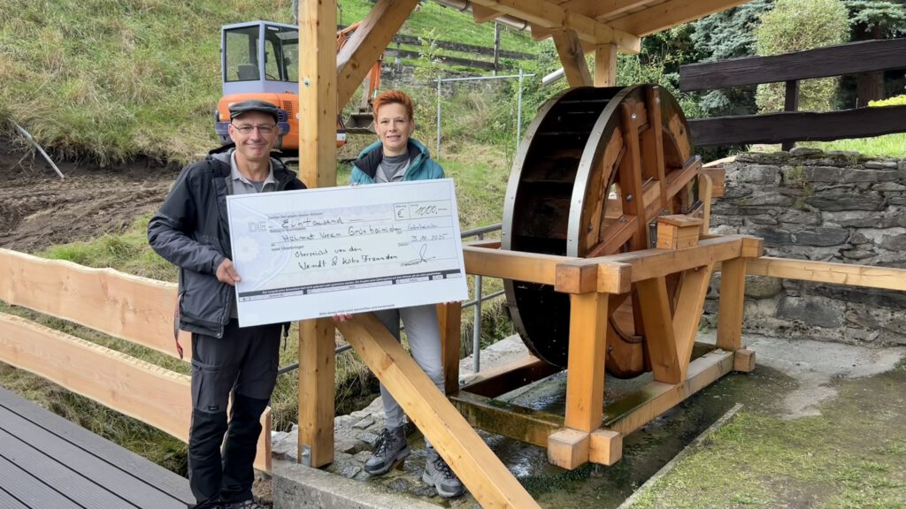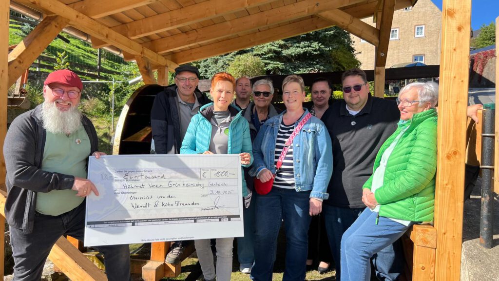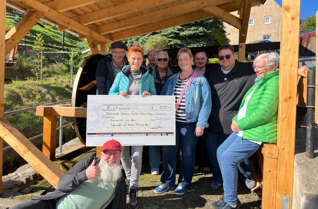 eine Spende, die sehr geholfen hat, dem Grünhainichener Mühlrad ein Dach zu errichten, wurde am 03.10. von der Facebookgruppe „Wendt & Kühn Freunde“ an uns übergeben. Diese Spende und auch die vielen anderen, haben uns erst in die Lage versetzt, Dach, Zaun und Brücke am Mühlrad in einen sehr schönen und vor allem rechtzeitig winterfesten Zustand zu versetzen. Vielen Dank noch einmal an alle Spender!!!